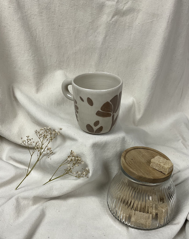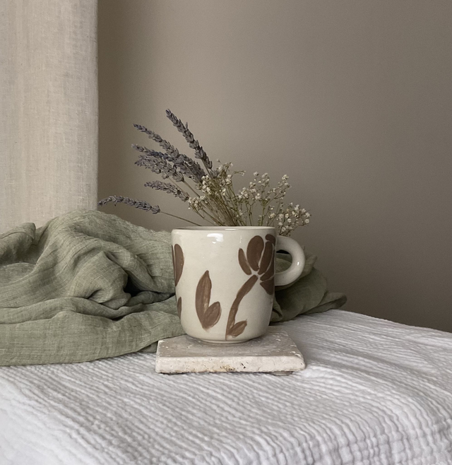 Tasse en grès fabriqué à la main, décorée de fleurs marrons.